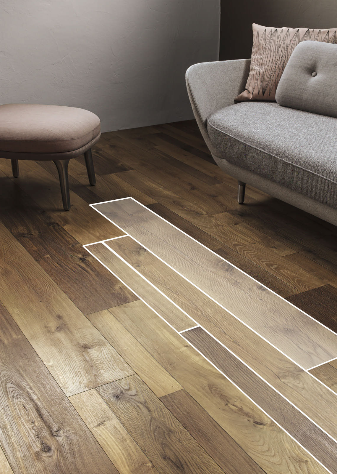 三合一系列,采用最新欧洲专利仿真分割线工艺,仿佛由三块地板拼制而成,千年古树树脂在树表面留下岁月的烙印,这种工艺欧洲人广泛使用在实木工艺上,只有奥地利Kaindl获得专利使用在复合地板上,把仿树脂材料压铸在装饰层上,再压耐磨层,这种超凡技术唯有百年木业集团Kaindl所拥有。