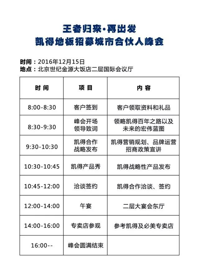 请有意向参加凯得地板招商会的经销商,于2016年12月8日前,联系程先生(电话:18688410598;QQ:691013597)取得并填好报名回执表并传真到必美集团客服部。传真号码:020-38814188,肖春媚收。客服邮箱:beamyworld@126.com