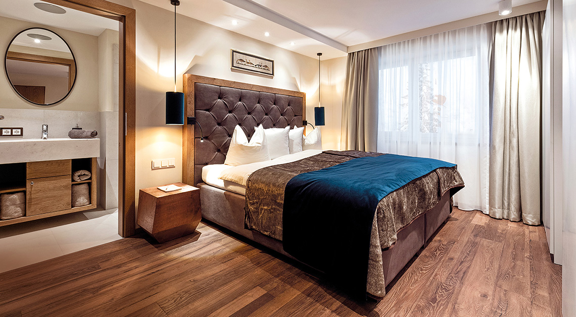 作为客房占比最大的地方,地板的质量很大程度上决定了整个房间的风格,房东太太优先选择奥地利本土百年品牌的凯得地板进行铺装。棕色系的地板表面处理简洁大方,且保留原木的毛细呼吸孔及天然清晰的纹理,巧夺天工,橘黄色的灯光一打,整个客房极具美感。